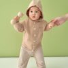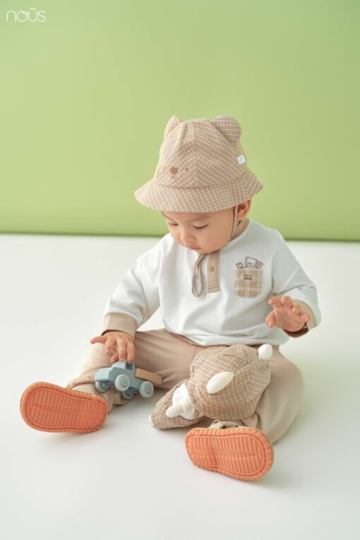 Set dài tay trắng phối nâu be đơn giản, điểm nhấn túi áo kẻ caro khỏe khoắn, quần cạp chun gọn gàng để bé thoải mái hoạt động, tung tăng khám phá cả ngày.